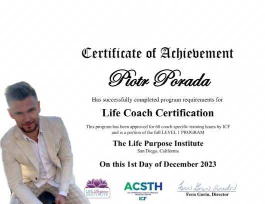 - Life Purpose Institute, San Diego, Kalifornia (Certyfikowany Life Coach)