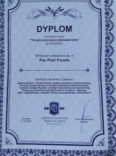 Pan Piotr to osoba niezwykle empatyczna, wolna od jakichkolwiek ocen co powoduje, że można być po prostu sobą. Narazie jestem po 2 spotkaniach, ale czuję że to były bardziej wartościowe rozmowy niż 2 lata wcześniejszej terapii. Polecam każdemu zmagającemu się z nerwicą, depresją, natrętnymi myślami specjalista posiada szeroki wachlarz metod i ćwiczeń, które pomogą przejść trudny proces zdrowienia.