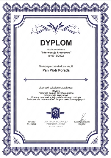Pan Piotr to niezwykle empatyczny człowiek,potrafi wysłuchać,dać czas gdy pojawiają się te mniej przyjemne emocje…czuję się zaopiekowana. Mam za sobą 3 konsultacje online i wiem,że zostanę na dłużej żeby przepracować swoje problemy. Czuję się tu bezpiecznie. Trafiłam na Pana Piotra z polecenia innego psychologa i to był strzał w 10…Każdy kto potrzebuje osoby,która nakieruje na dobre tory to uważam,że Pan Piotr jest odpowiednią osobą na odpowiednim miejscu,z resztą nazwisko mówi samo za siebie :)